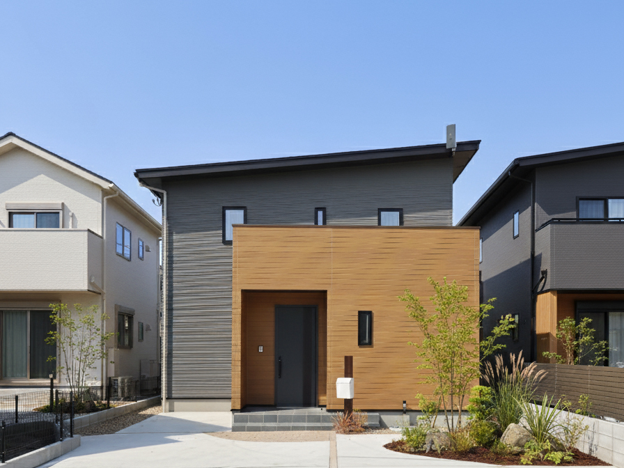 グレーの外壁と木目のアクセントを合わせたかわいらしい外観。