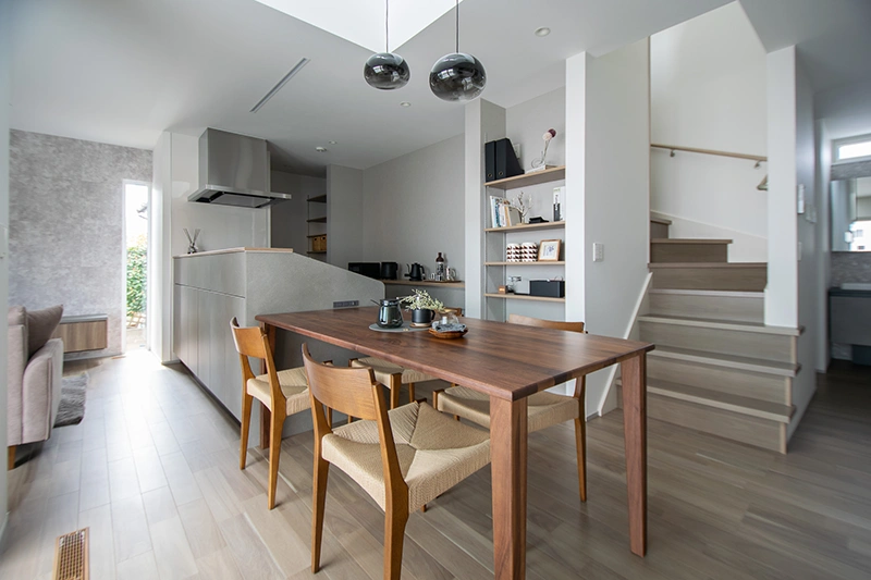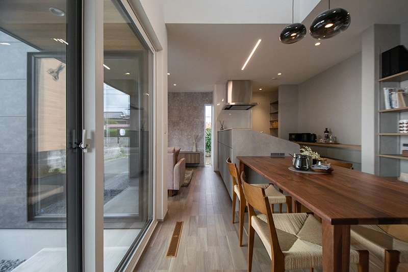 ダイニングとサッシを挟んで隣り合わせに外部スペースがあるのでアウトドアリビングを楽しめます。