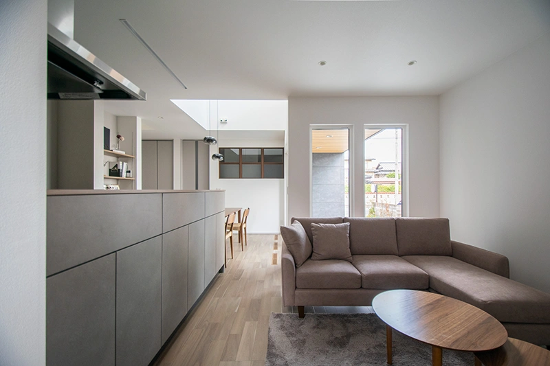キッチンはマルチ収納対面プラン。前部分が立ち上がっていてリビング側から手元を隠せます。
