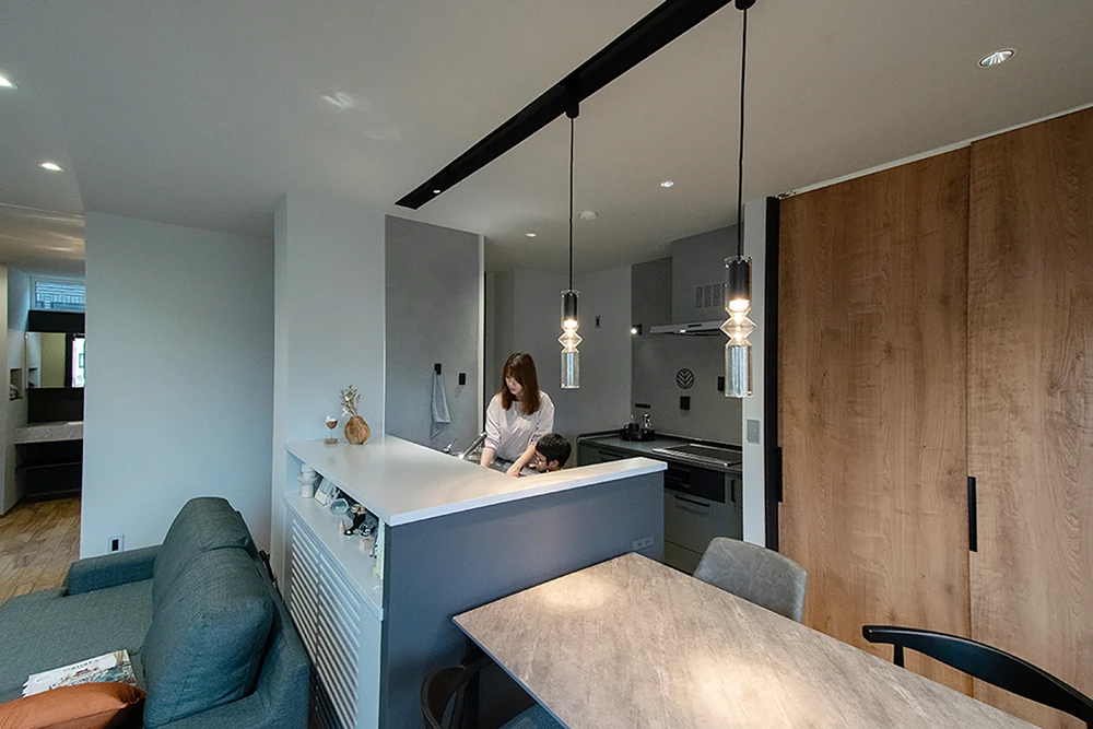 お料理がもっと楽しくなる憧れのⅡ列型のキッチン。ダイニングテーブルも横並びなので無駄なく家事効率が格段に上がります。