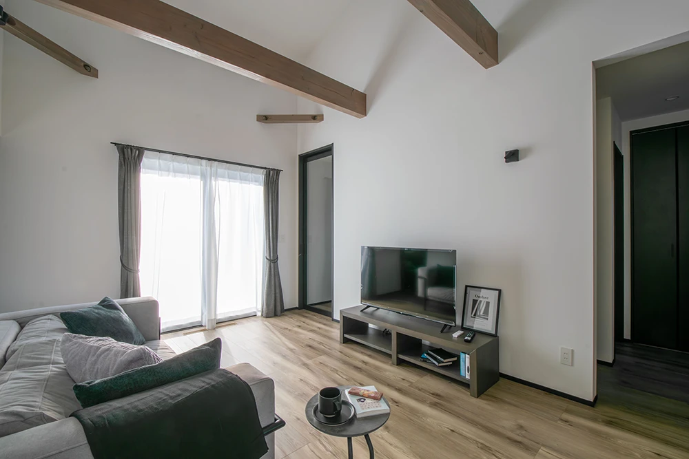 勾配天井の火打ち×あらわし梁で室内の奥行きと開放感バツグン。床と合わせてたウッドデザインでトータルコーディネイトが完成。