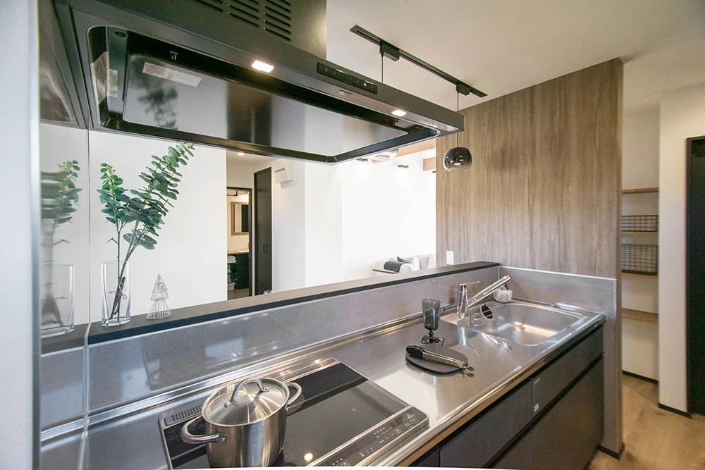 床から天井までの長いキッチンエンドパネルで水ハネ防止とリビングとのゾーニングに活躍。裏側にはインターホンや給湯器のリモコンパネル類を設置してスッキリ。
