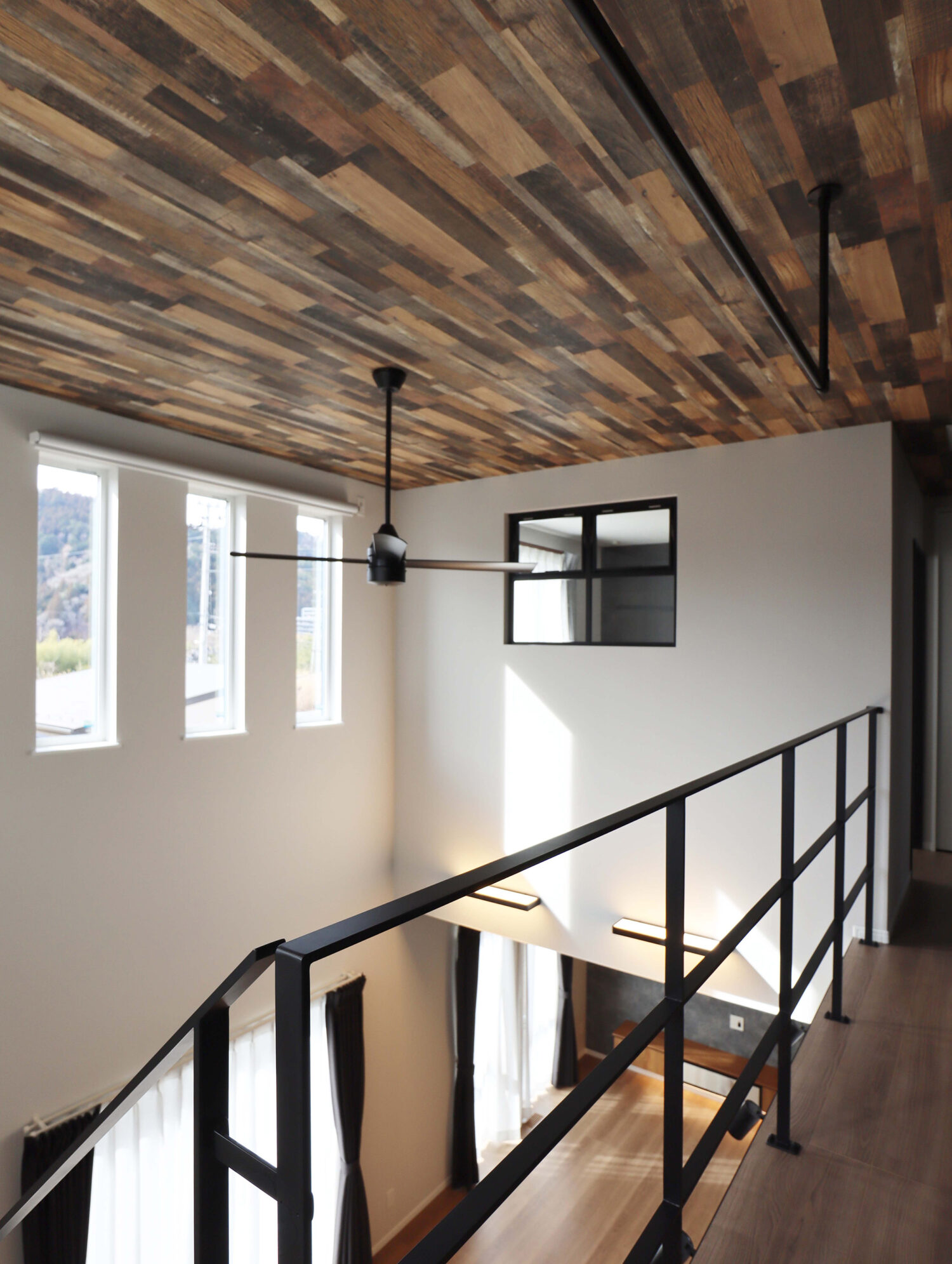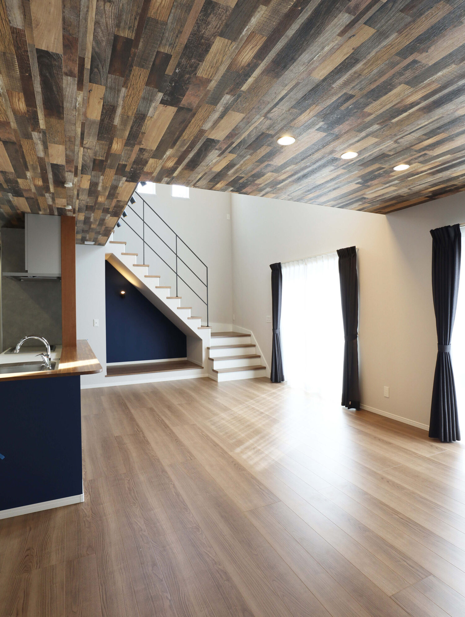 室内は、開放感あふれる吹き抜けリビングが住まいの中心。天井には木目のアクセントクロスを採用し、空間に奥行きと落ち着きを演出しています。大きな窓から光が差し込み、時間帯によって表情が変わる明るいLDKになりました。