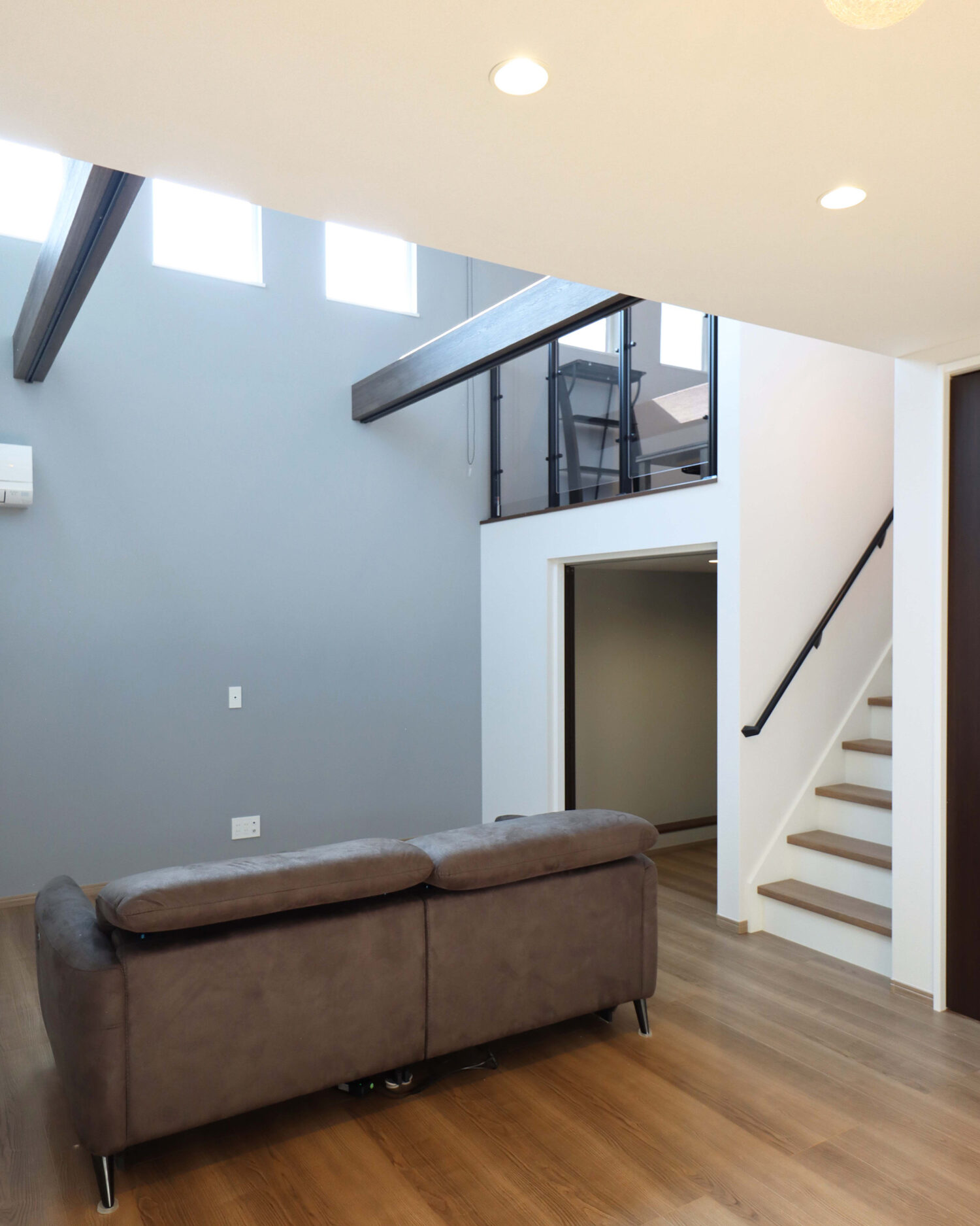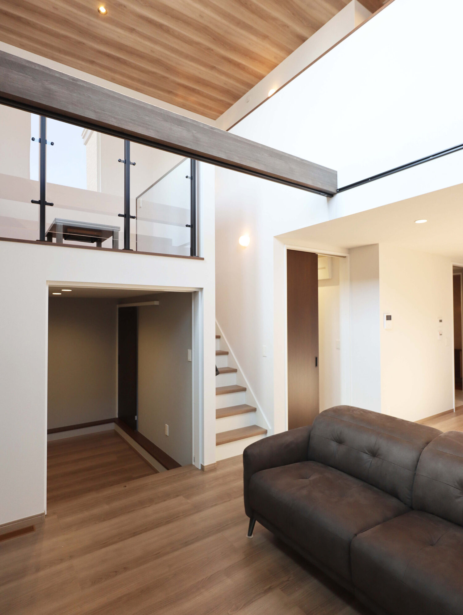 外観は直線的で落ち着きのあるデザインにまとめ、内観は吹き抜けとダウンフロア、スキップフロアを取り入れた開放感のある住まいとなりました。