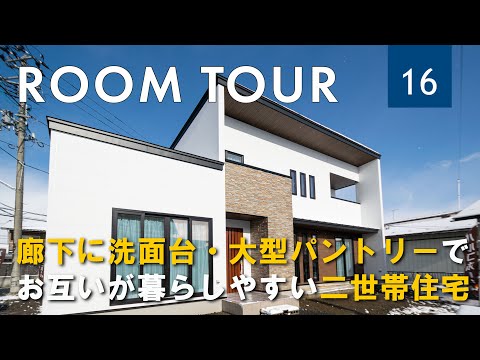 玄関を入って直進した先に洗面スペースを設けました。帰宅後に居室のドアに触れずに手洗いができ、親世帯からも行き来しやすい位置の間取り。