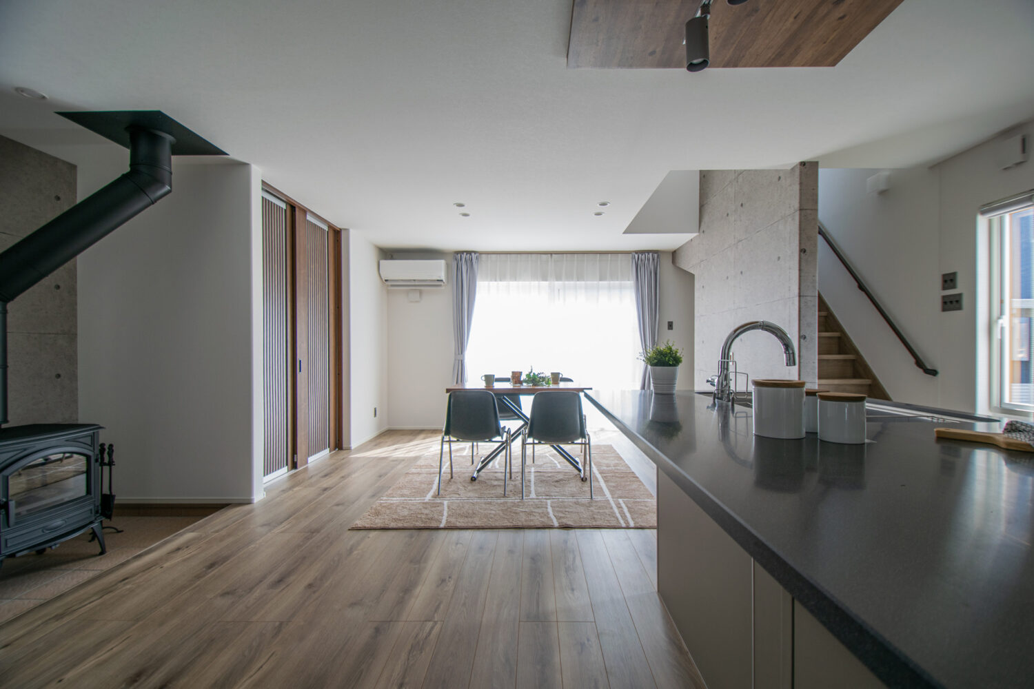 薪ストーブはI型(横一直線)のLDKの真ん中に配置しました。19.4帖と広いLDKも隅々まで温めてくれます。