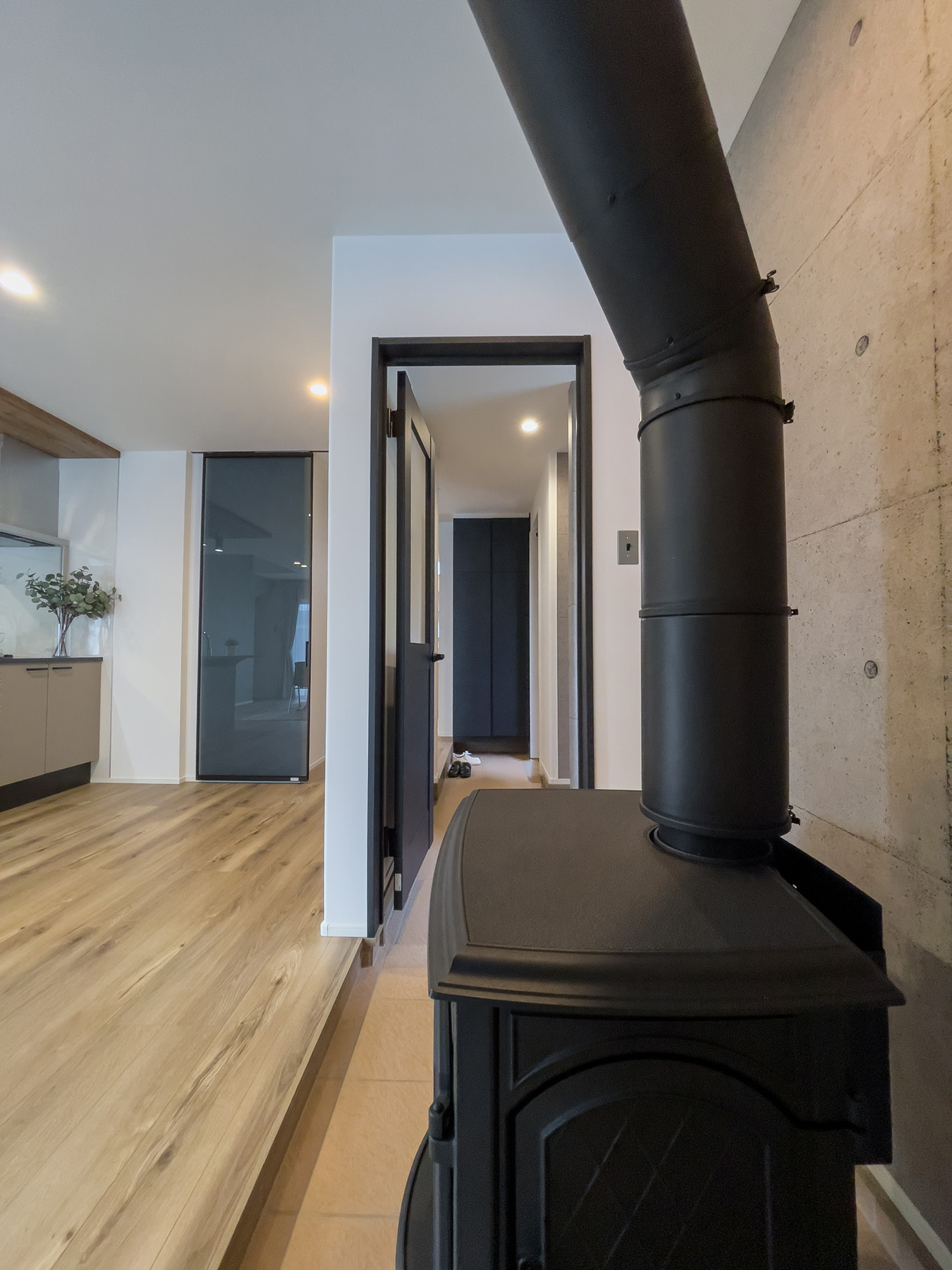 LDKに面して置かれた薪ストーブは土間収納の延長にあるので薪や灰の取り扱いも容易になります。