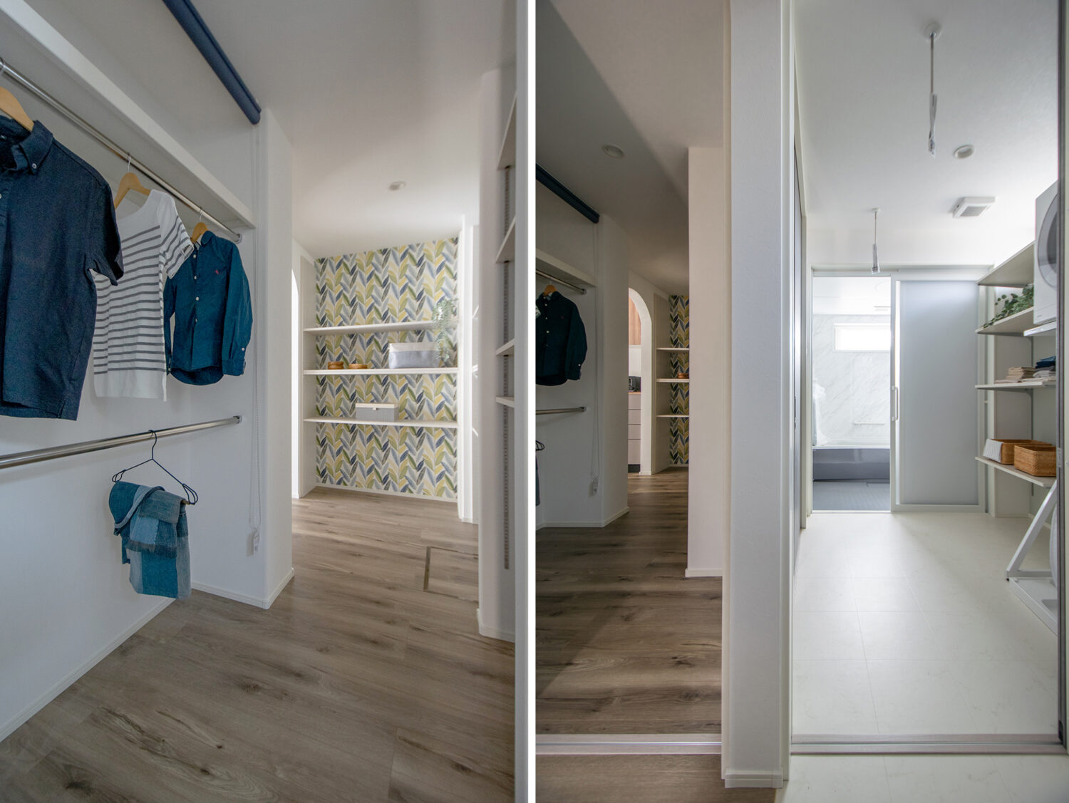 玄関→手洗い→ファミクロ→パントリーの帰宅動線だけでなく、一か所で洗濯完結動線ともリンクして家事の同時進行と時短を叶えます。
