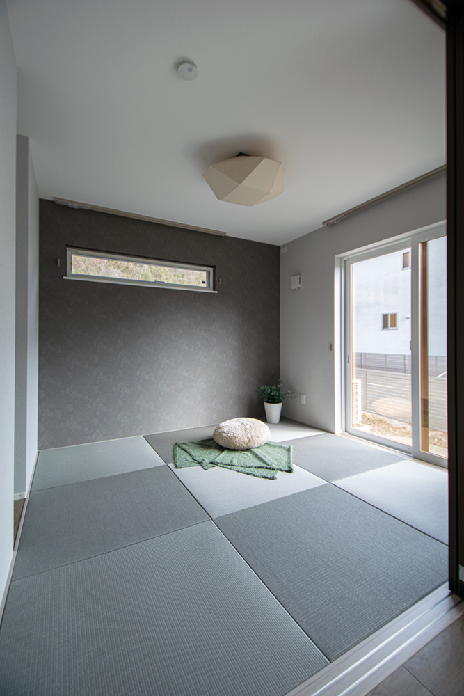 LDKに隣接した5.9帖の和室は、戸をあけてLDKの一部として広々使用できます。適度なクッション性により、お子様の遊び場や、疲れた時のごろ寝スペースなど、家族の団らんとくつろぎの空間となるでしょう。モノトーン系でまとめた内装にアクセントで和紙の質感を生かした照明を合わせた和モダンな和室に仕上がりました。