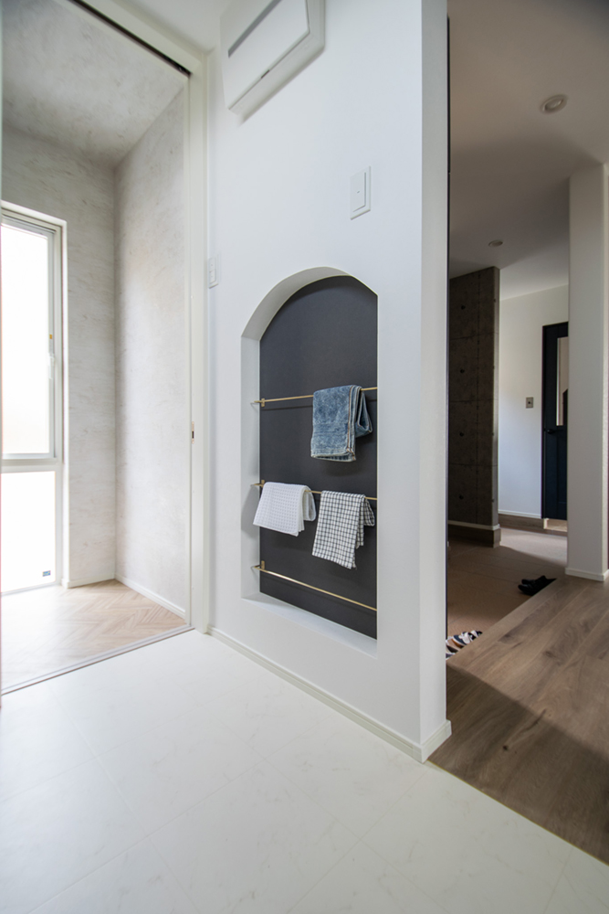 洗面台はTOTO様のエスクアを採用しました。木目調×白×タイルで清潔感があるちょっとレトロな北欧風のインテリア。洗面台に対面する壁にはアーチ型のタオルがけニッチを設けました。バーは真鍮色でグレーのアクセントクロスに良く映える取り合わせです。