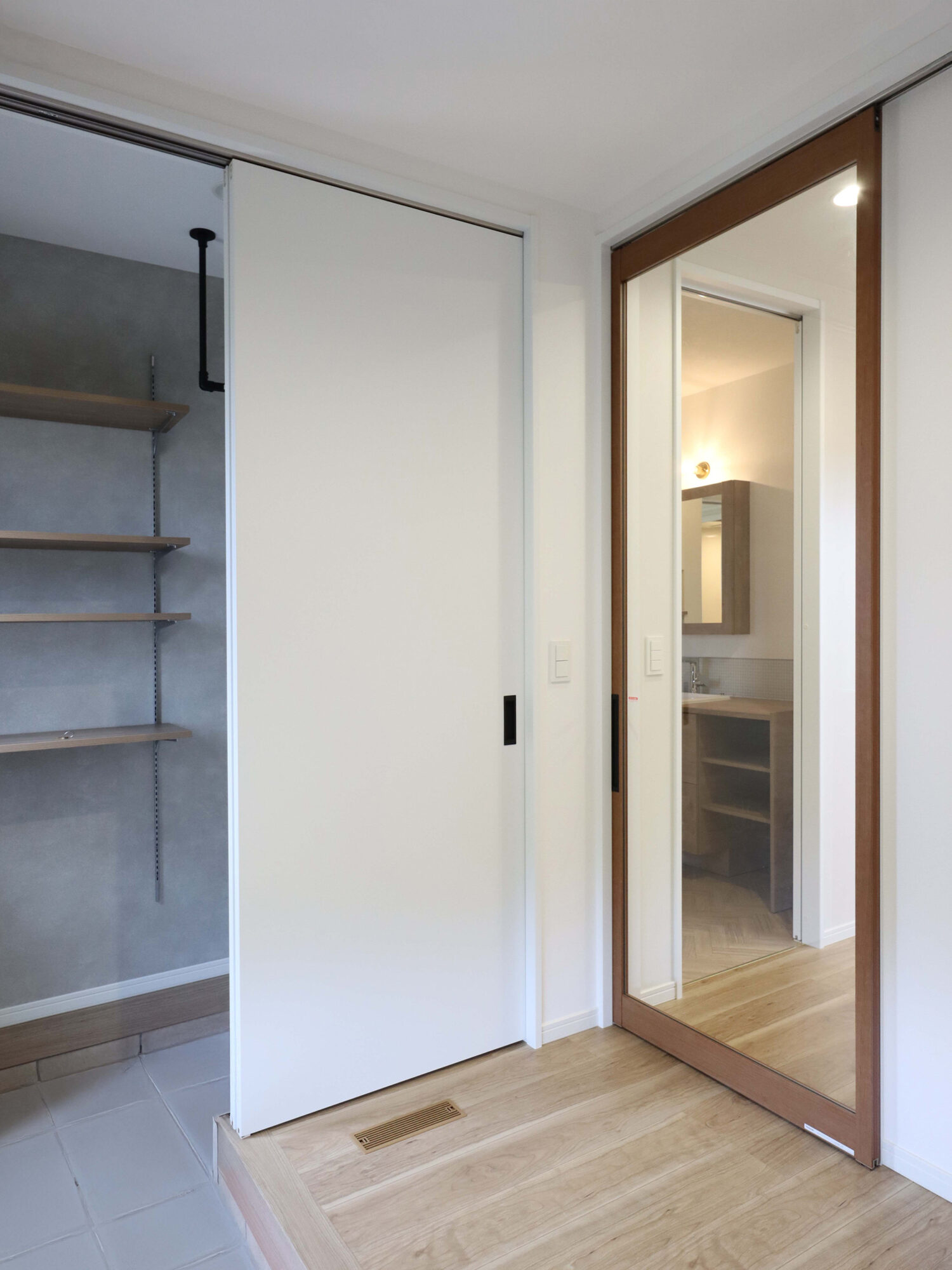 玄関の土間収納や透明ドアが、明るくすっきりした動線を作る住まい。