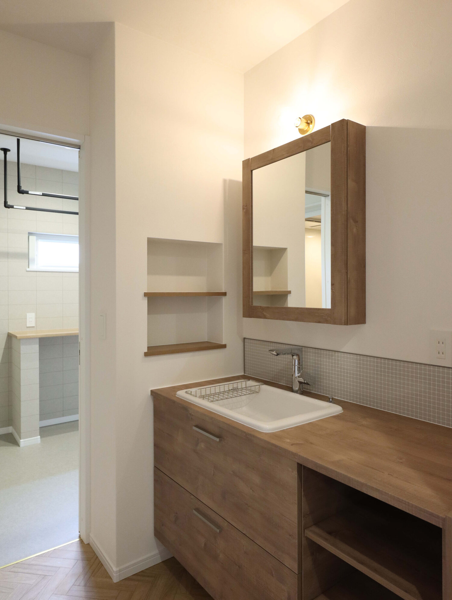 木のあたたかみを感じる造作洗面は、やさしい雰囲気で毎日の身支度が心地よくなる空間。