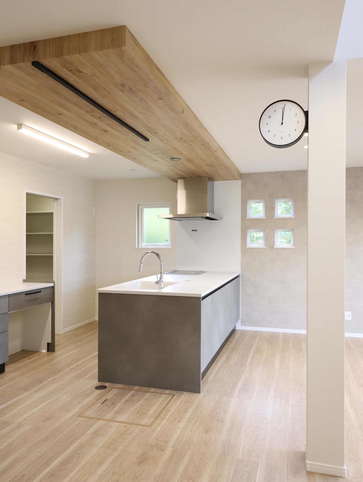 リビングは吹き抜けで、光がふんわりと降り注ぎ、家族が自然と集まる場所に。キッチンは動きやすい動線としっかりした作業スペースで、毎日の料理がぐっとラクになります。