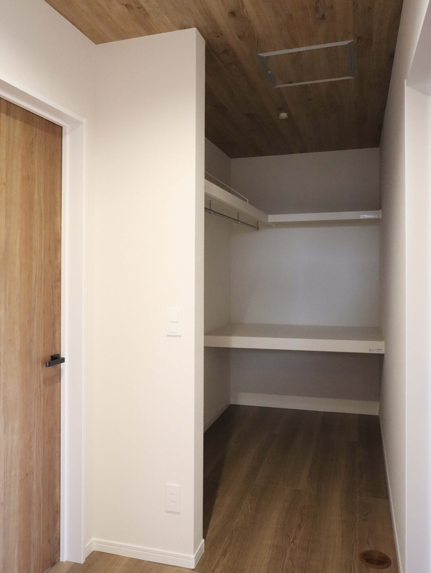 二階に上がると、大容量のファミリークローゼットがあり、家族の衣類や日用品をまとめて収納できます。動線がスムーズで、片付けがしやすい空間です。