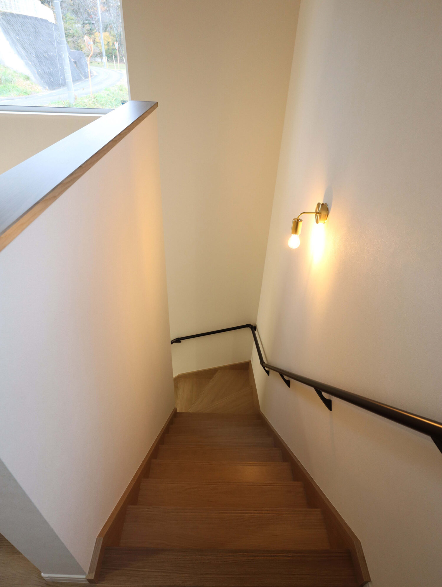 階段の途中に照明を置き、やさしい光で足元を照らすデザイン。上は吹き抜けになっていて、明るさと開放感がしっかり感じられます。