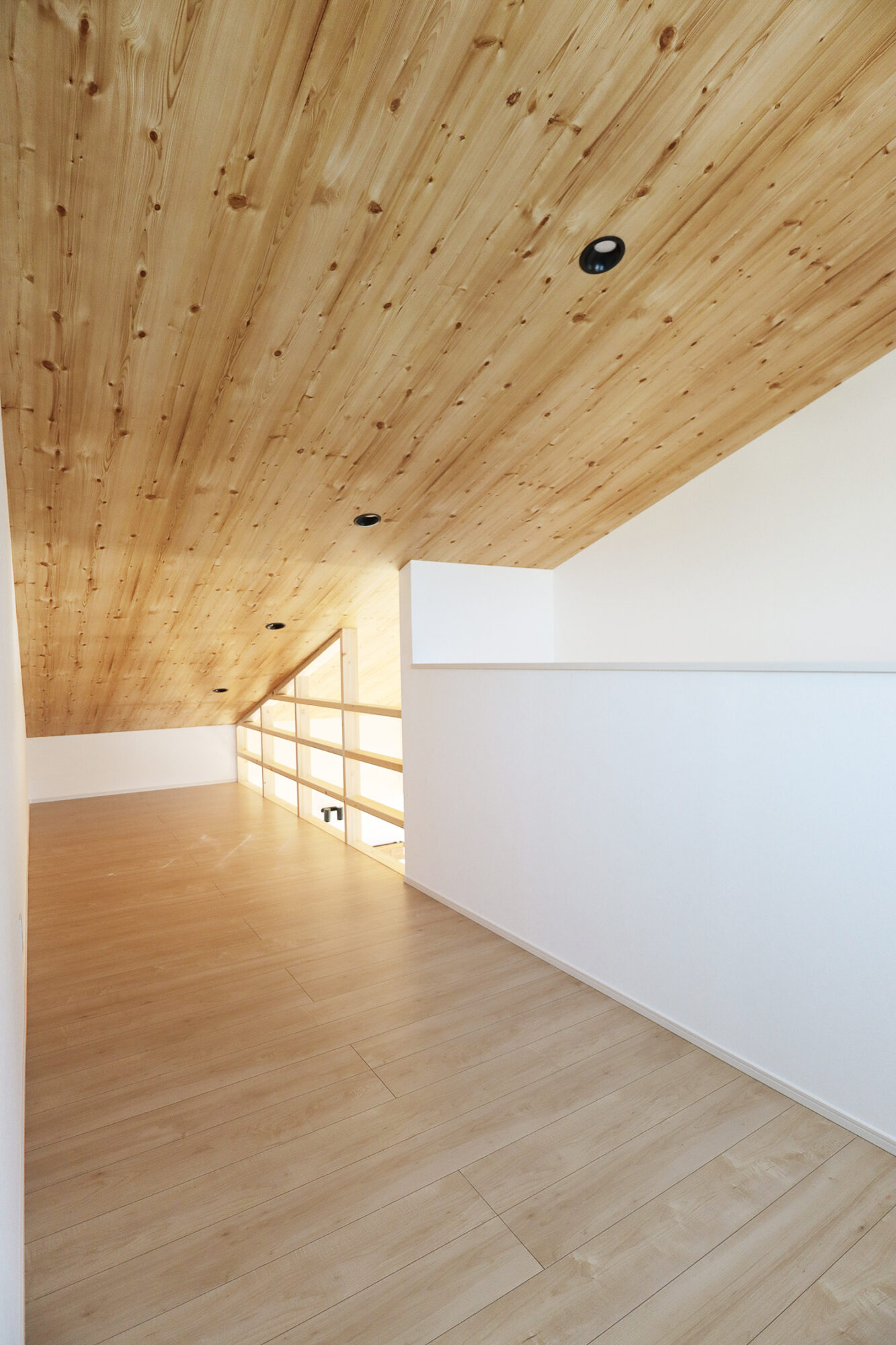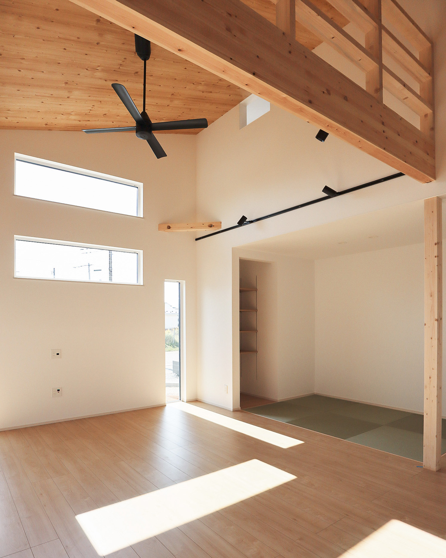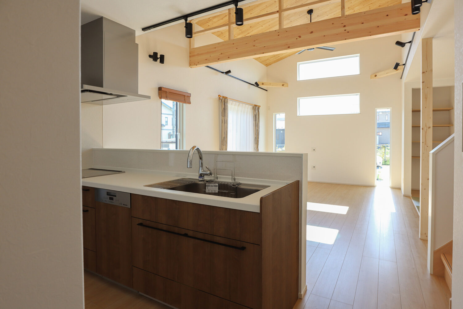 片流れ屋根と白い外壁が印象的な、ナチュラルで軽やかな佇まい。玄関を入ると、光が心地よく広がる吹き抜けのリビングが迎えてくれます。キッチン横には、大容量のパントリーを配置し、食材や日用品をすっきり収納。ランドリーは「洗う・干す・片づける」がひとつの空間で完結するゆとりの広さで、毎日の家事が驚くほどスムーズに。廊下には造作洗面を設け、帰宅後すぐに手洗いができる便利な動線を叶えました。さらに2階には、子どもたちがのびのび遊べるスペースを確保。