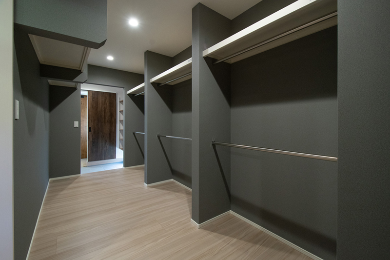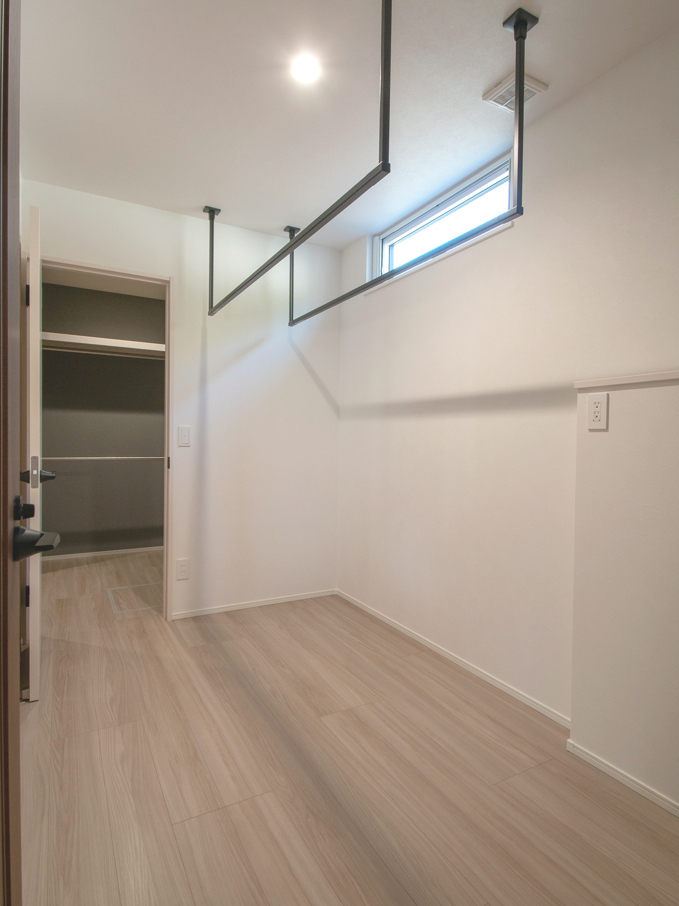 ファミクロと隣接したランドリールーム。帰宅後、汚れた衣服はすぐにランドリーに持ち込めます。洗濯が終わったらハンガーバーで干して、そのままファミクロへ。3秒アクセスの家事ラク動線です。