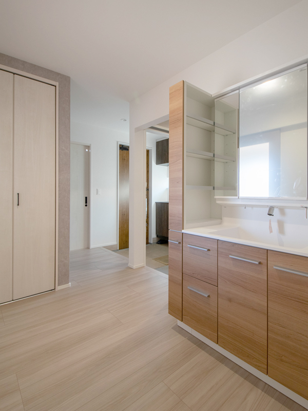 ホールに洗面台を配置することで、帰宅後すぐに手洗いができる衛生的な動線を確保。