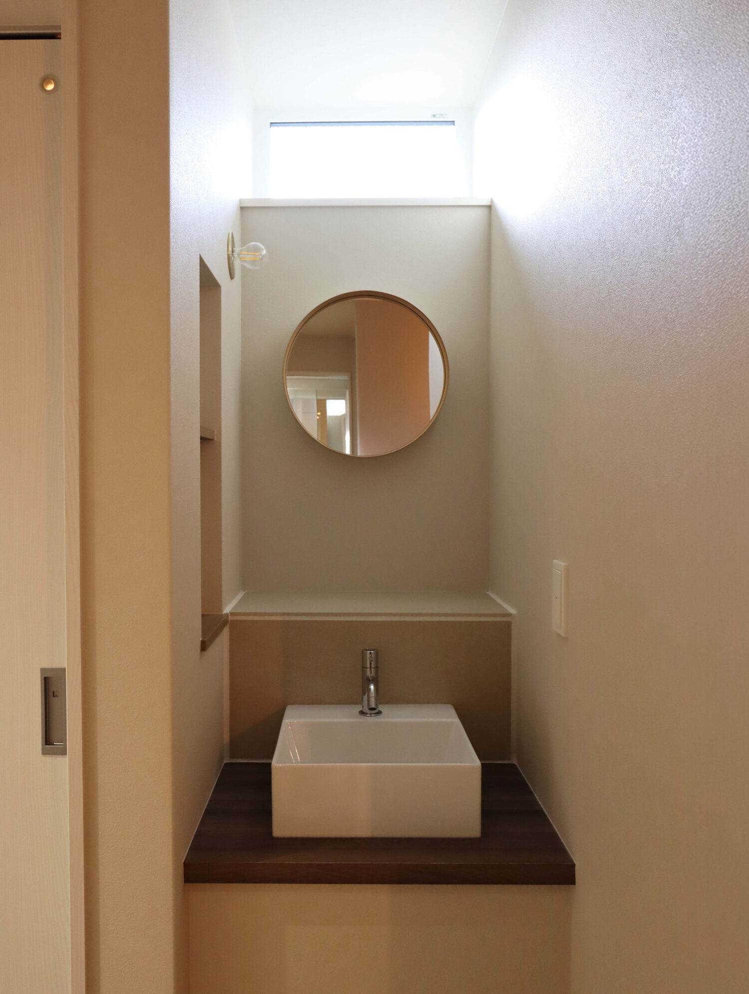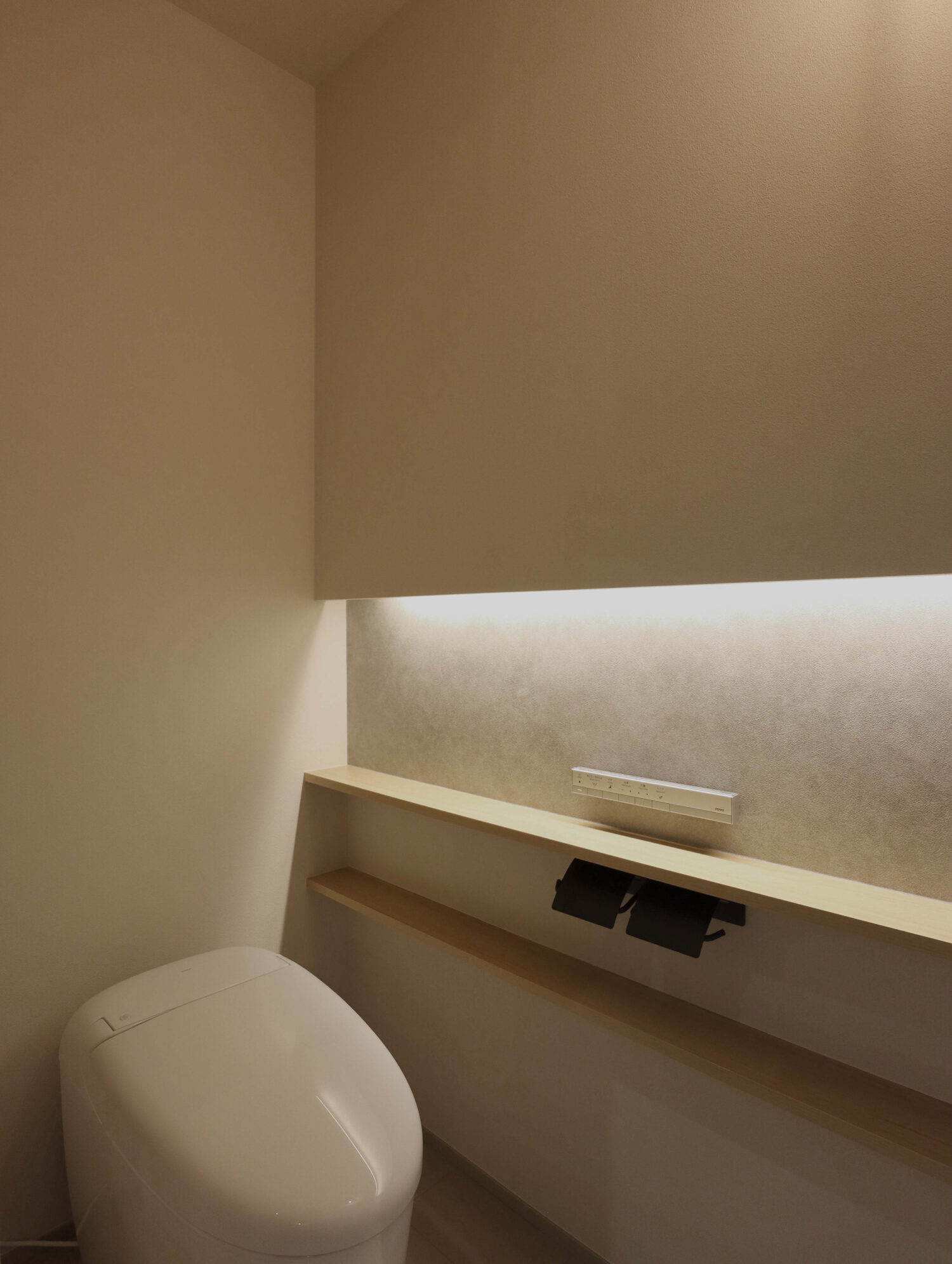 間接照明で心地のいい空間に。玄関横の手洗い場の下を利用し、トイレの収納スペースになっています。