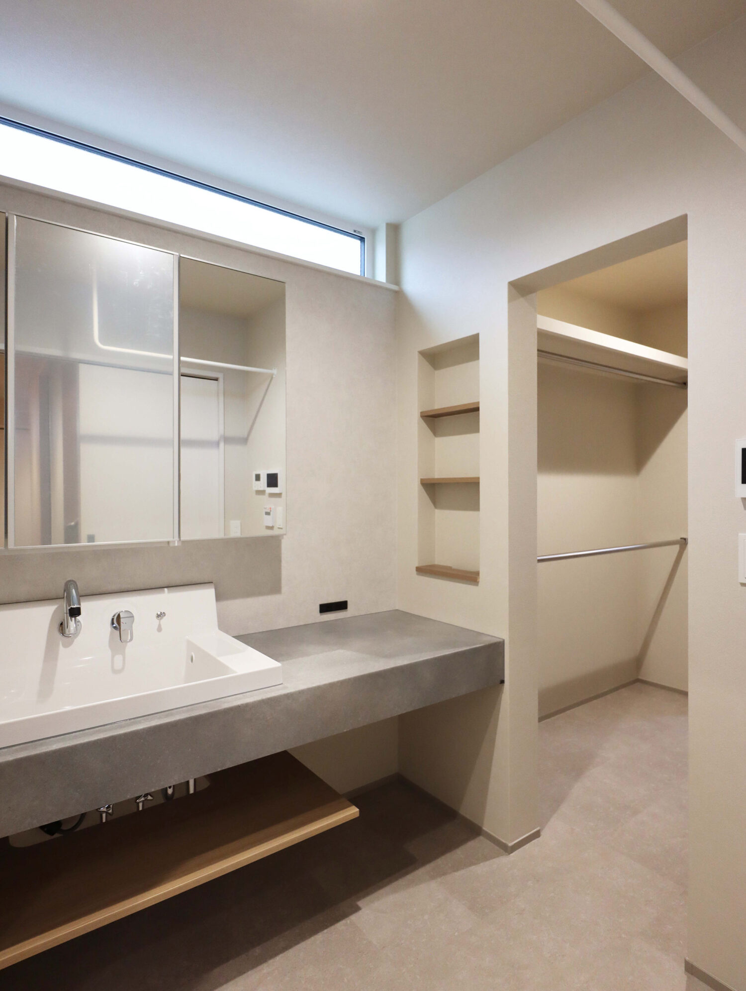 グレーと木目で落ち着いた雰囲気の洗面に。すぐ隣にはWICがあり、生活しやすい動線になっています。