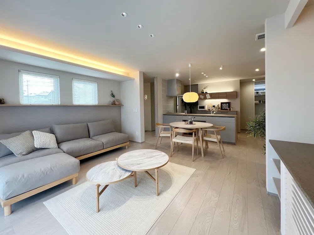 あたたかみのある木目調の家具とグレーのソファが調和した、モダンで開放的なリビング。間接照明が心地よい空間を演出し、洗練された北欧風の雰囲気が漂います。