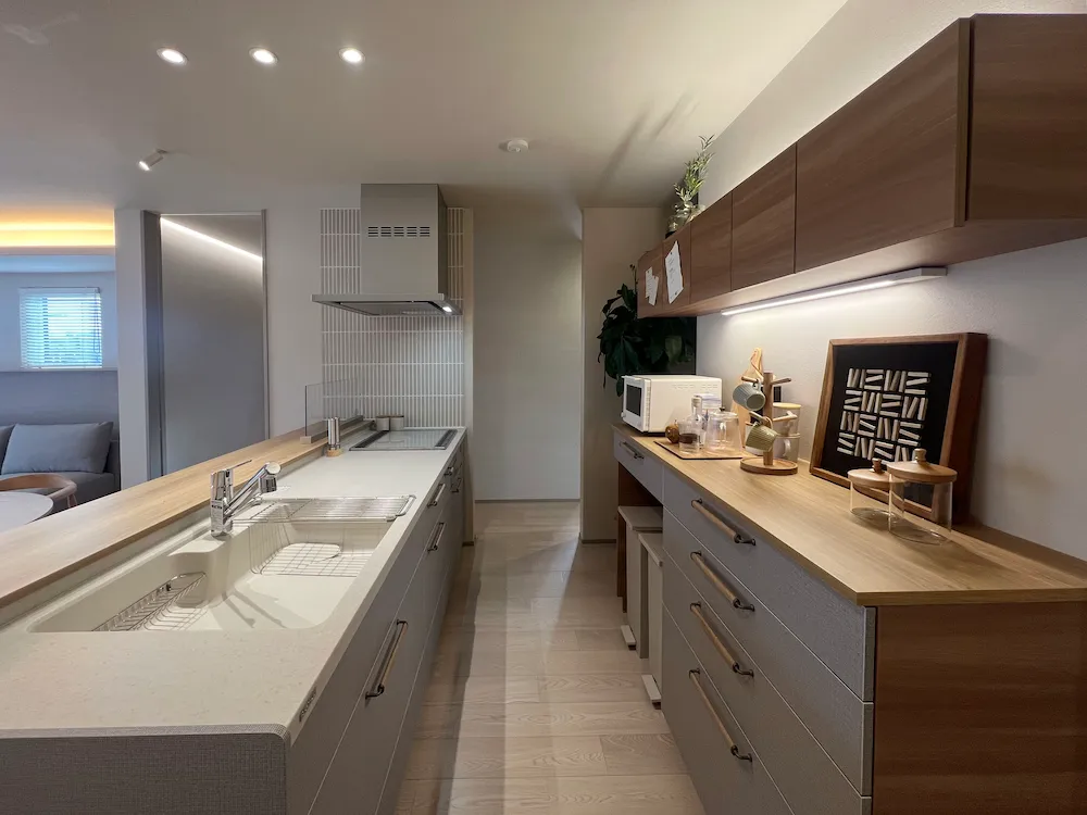機能美と温もりが調和したキッチン。木目調の吊り戸棚とグレーの収納が洗練された印象を与え、広々としたワークトップが家事を快適にする、モダンな空間です。