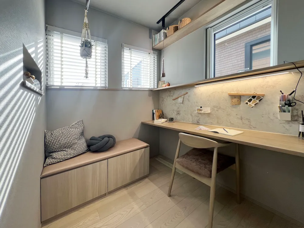 柔らかな光が差し込む、落ち着いた雰囲気の家事室。広々としたデスクと収納付きベンチを備え、読書や手作業など、多目的に活用できる心地よいプライベート空間です。