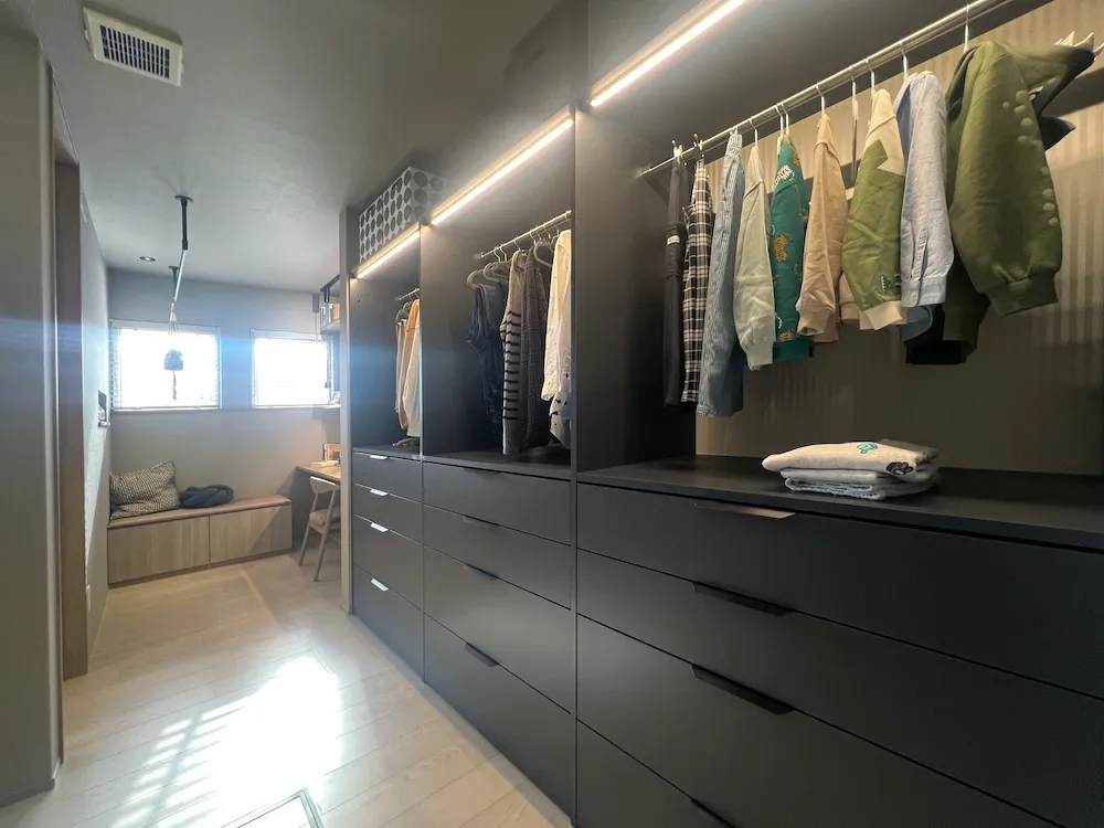 シックなダークトーンで統一された、大容量のシステム収納。ハンガーパイプと引き出しを組み合わせ、衣類や小物を機能的に整理できる、洗練されたウォークインクローゼットです。
