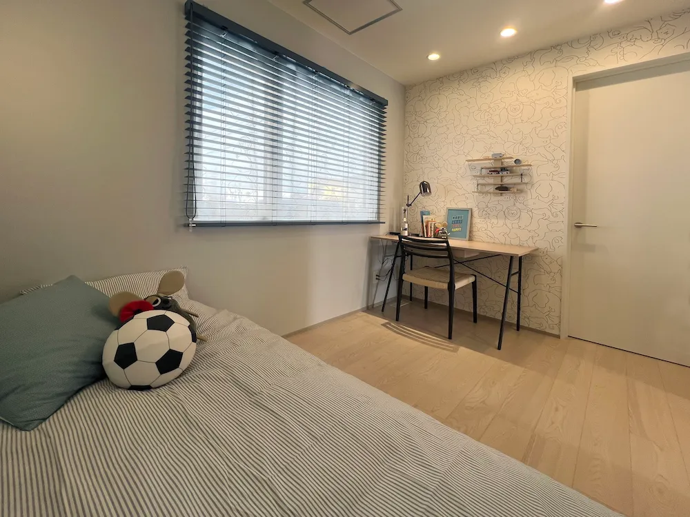 遊び心あふれるアニマル柄のアクセントクロスが印象的な子供部屋。コンパクトなデスクとシンプルなベッドを配置し、お子様の成長に寄り添う快適なプライベート空間です。