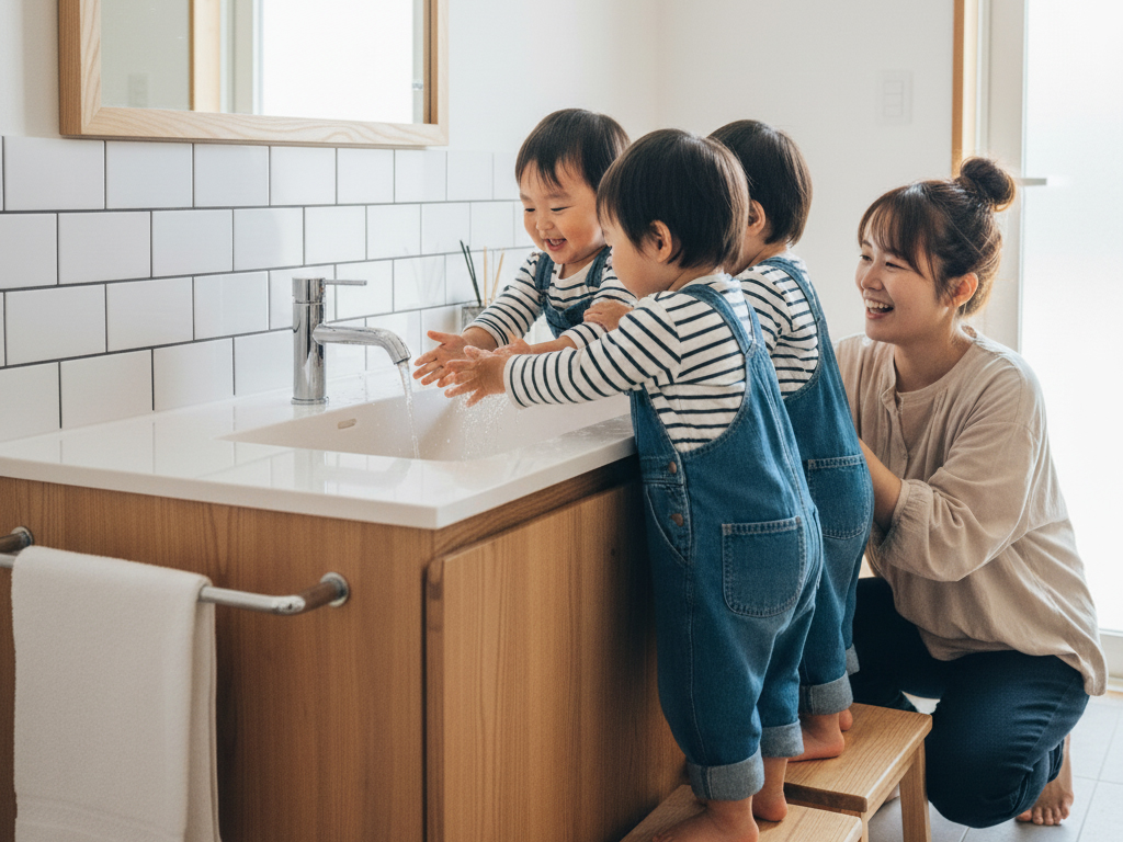 小さなお子様が3人もいれば、外遊びの後は泥だらけ、手洗いは必須。急な「おしっこ!」にもすぐ対応したい。