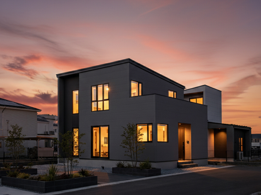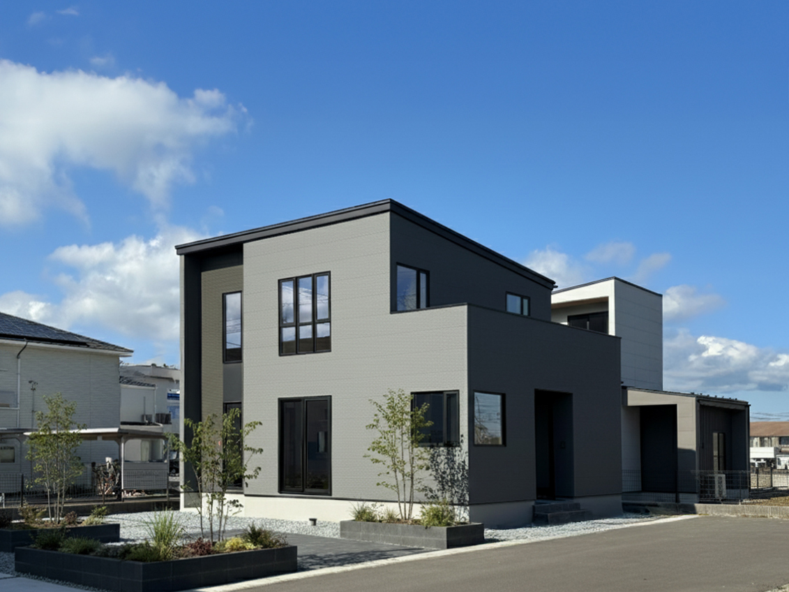 縦ラインを強調した窓とブラックのサッシが引き締める、モダンな外観。