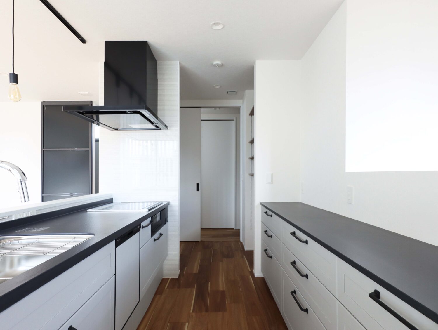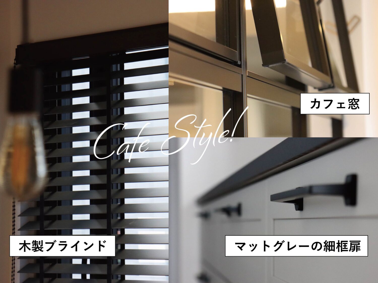NYのモダンなカフェを思わせるブラックの木製ブラインドや、カフェ窓、キッチンの細框扉を組み合わせることで、毎日がカフェのような、特別で快適な時間をお過ごしいただけます。