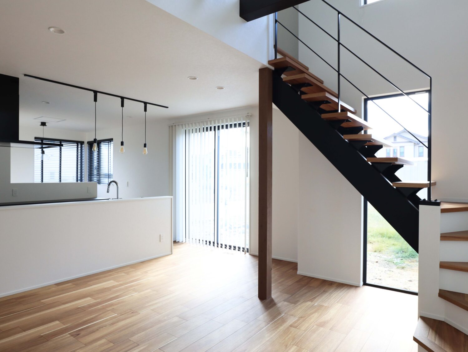 リビングには、テレビボードやベンチも兼ねるL字型オープン階段。縦長のスリット窓から暖かな日差しが差し込みます。