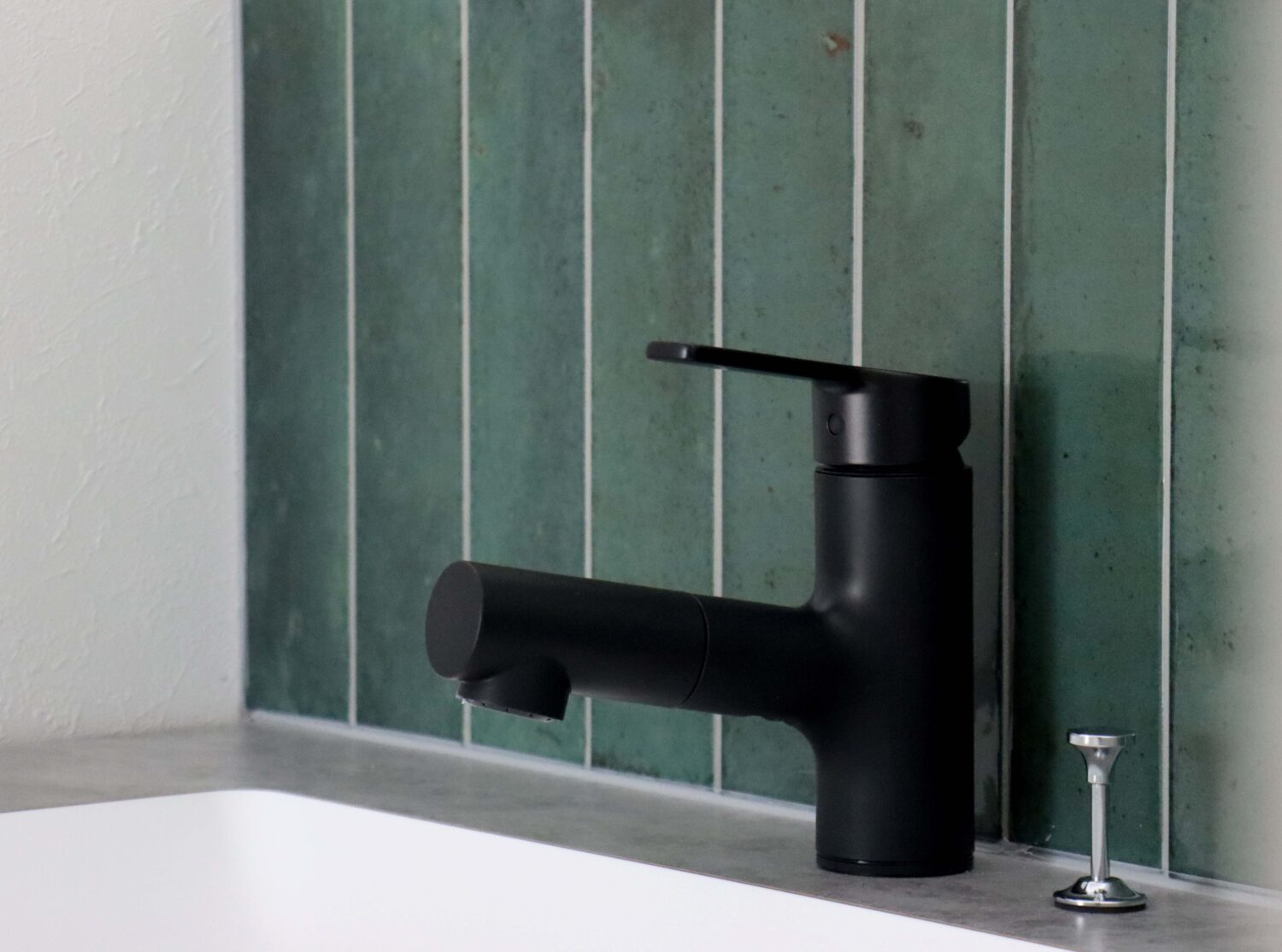 家全体のカラーをモノトーン×木目にしつつ、洗面台のみ深みのあるグリーンのタイルを採用。