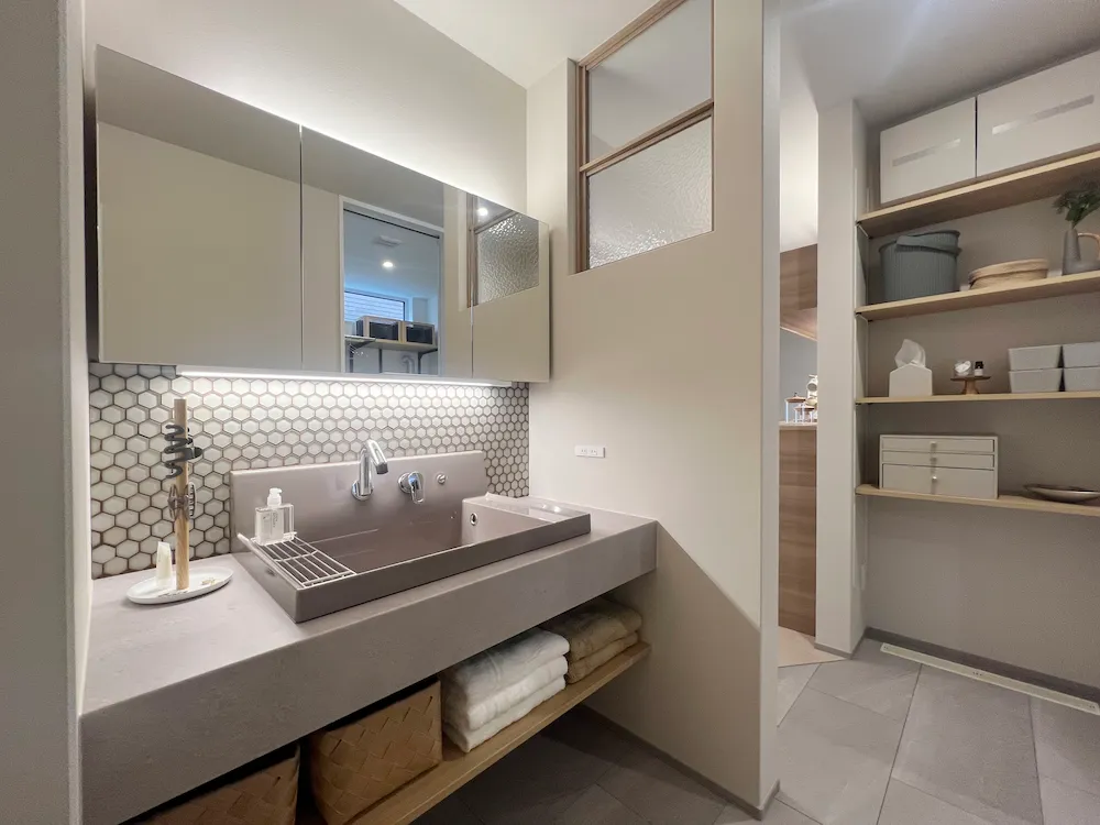 ハニカムタイルのバックガードが目を引く、洗練された洗面コーナー。ワイドな鏡とボウル、機能的なオープン収納を完備し、ホテルのような優雅さと使い勝手を両立しました。