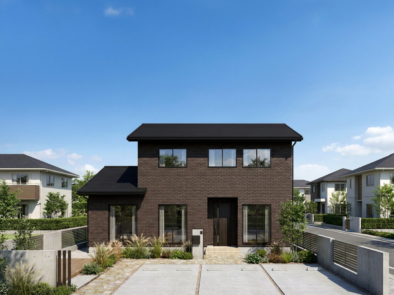 落ち着いたダークトーンのタイル調サイディングが、重厚感と洗練された印象を与える外観デザイン。